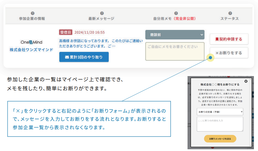 参加した企業をお断りするには参加企業の一覧から「お断りをする」をクリックします。お断りのご連絡には、入力の手間を軽減できるテンプレートをご用意しています。お忙しい場合でも簡単に対応いただけますので、ぜひご活用ください。