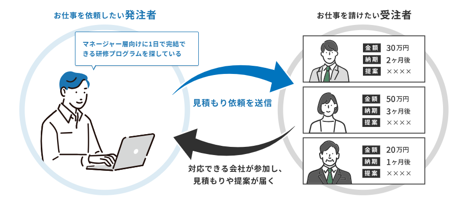 比較ビズは「お仕事を依頼したい人」と「お仕事を受けたい人」を無料で繋ぐ、ビジネスマッチングサービスです。依頼したい人(発注者側)は条件にマッチした人(企業)から見積もりが届いて比較できます。