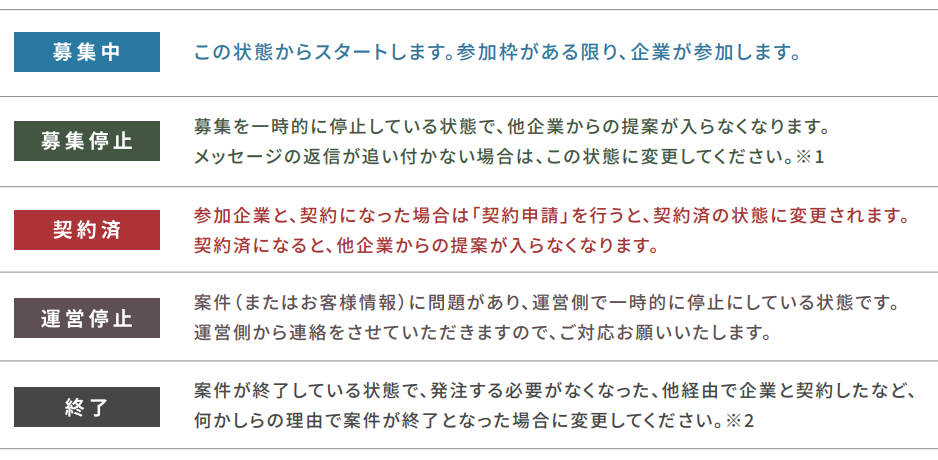注意点として、「終了」ではなく一時的な募集のストップ状態です。 案件の発注状況が確定されましたら、必ず「契約」または「終了」の処理が必要となります。
