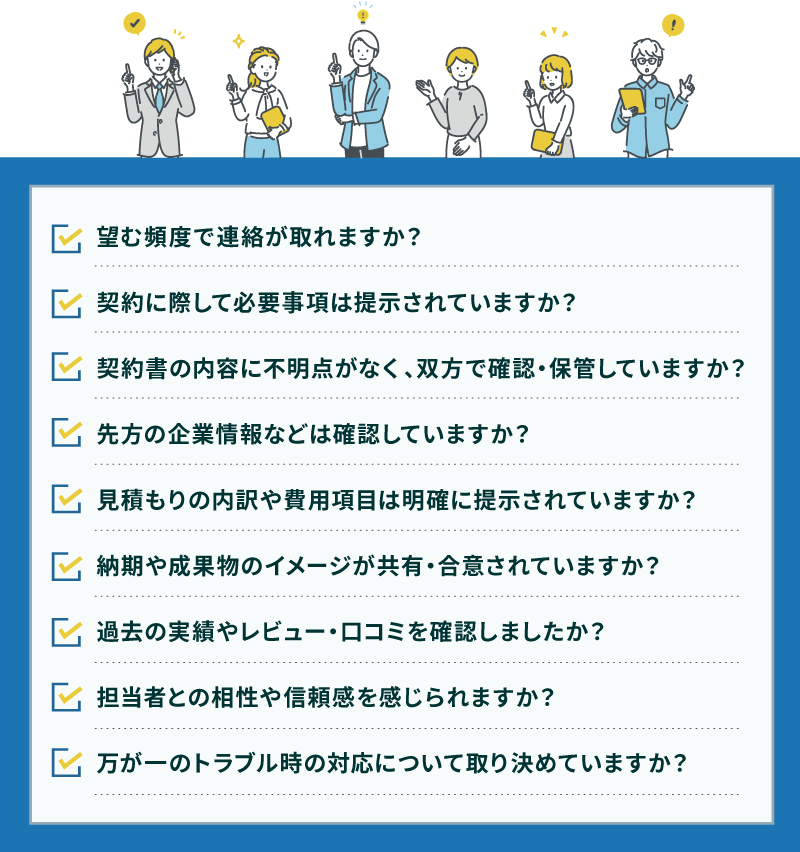 比較・検討の段階から契約直前まで、以下のチェックリストを「確認漏れがないかのツール」としてご活用ください。 「価格」や「提案内容」だけでなく、進め方や対応体制まで確認することで、より安全に取引を進められます。