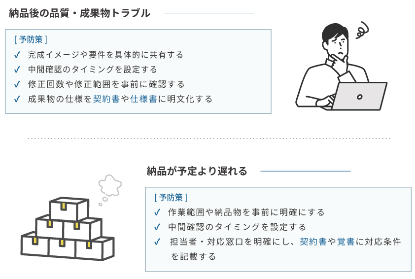過去の事例から、特にトラブルになりやすいポイントを「コミュニケーション」「納期・品質」「金額」の3つの観点で整理しました。