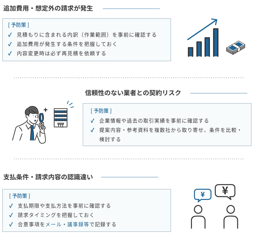 - 支払条件の認識相違:支払いのタイミング(前払い・後払い・分割など)や方法は、必ず事前に合意しておきましょう。